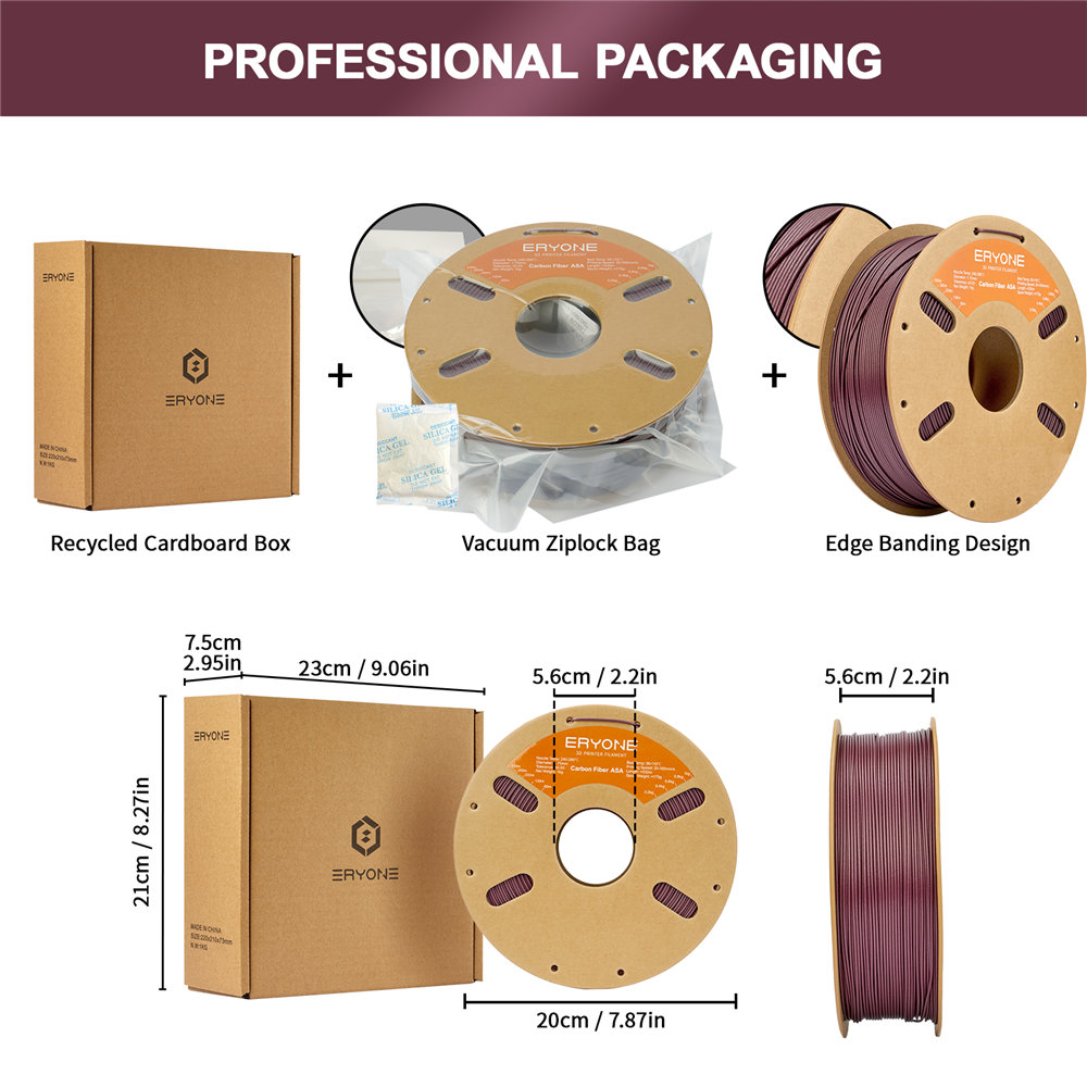 ERYONE ASA-CF Purple Red je kompozitní filament na bázi ASA (Acrylonitrile Styrene Acrylate) vyztužený uhlíkovým vláknem. Spojuje mechanickou pevnost podobnou ABS, vysokou odolnost vůči UV záření a povětrnostním vlivům a výborný matný povrch. Díky tomu je ideální pro dlouhodobě používané funkční díly v exteriéru.